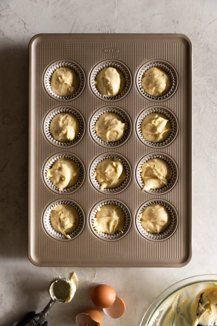 - Using an ice cream scoop or cookie scoop, scoop the batter into the cupcake liners about 3/4 of the way full.