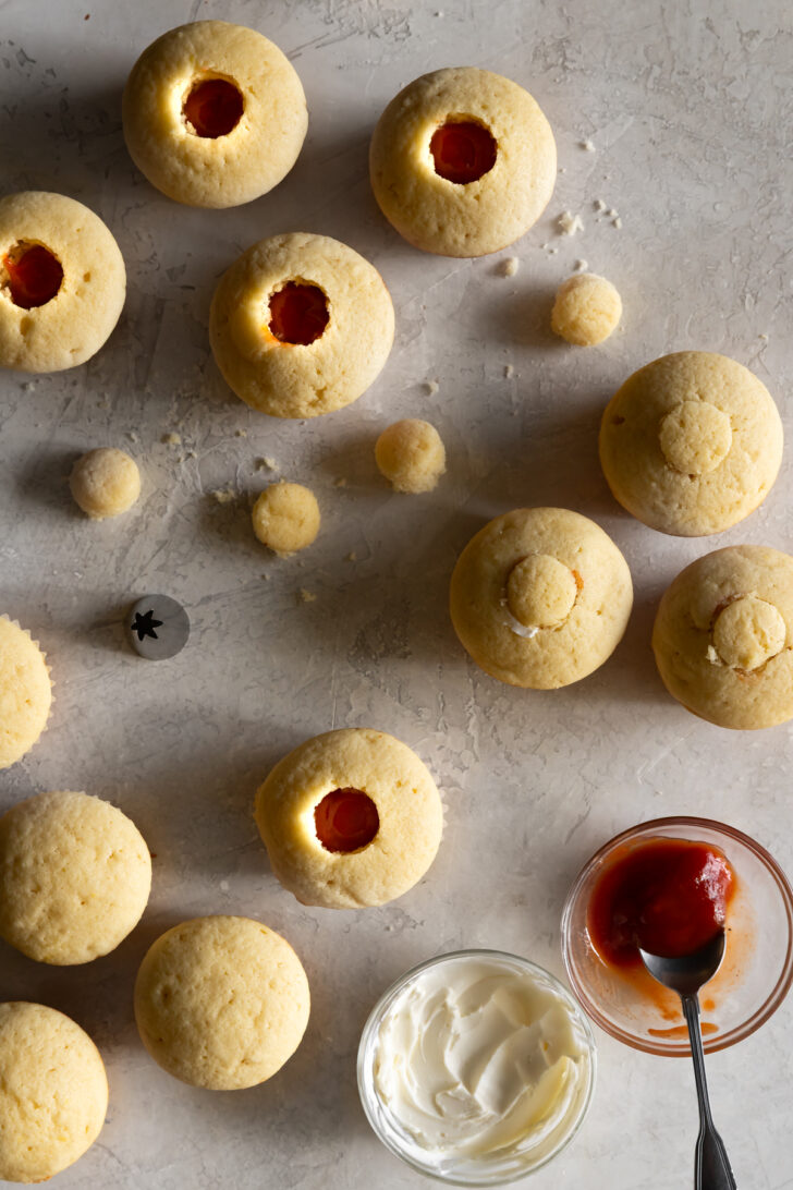 - Fill the cupcakes with the guava marmalade and a sliver of cream cheese. Gently press the circle piece back on top of the cupcake.