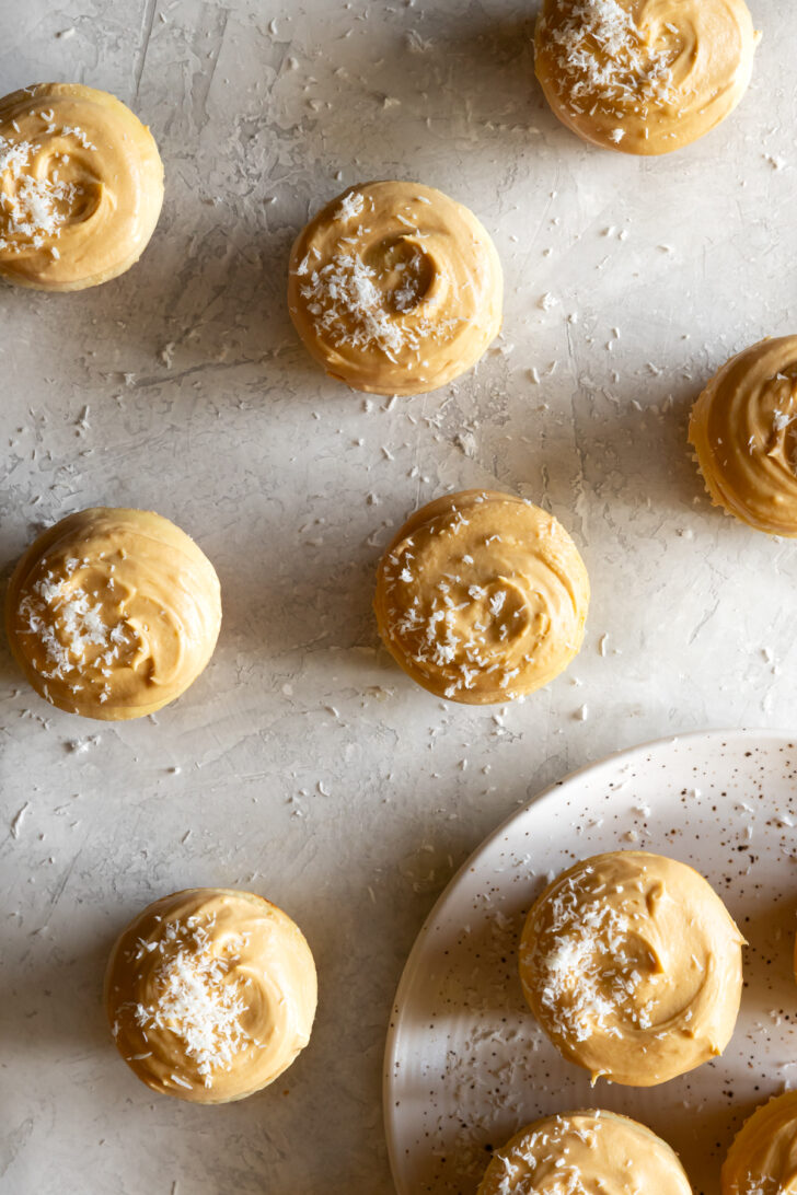 - Pipe the dulce de leche frosting over the cupcakes. Sprinkle with shredded coconut flakes. Enjoy!