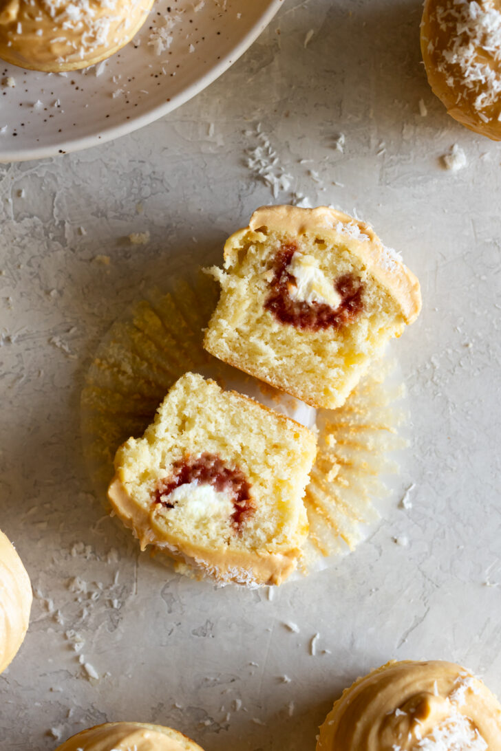 Making these cupcakes is easier than it looks! Just mix the batter, bake until golden, then fill each cupcake with guava marmalade and cream cheese before topping with creamy dulce de leche frosting and a sprinkle of shredded coconut flakes.